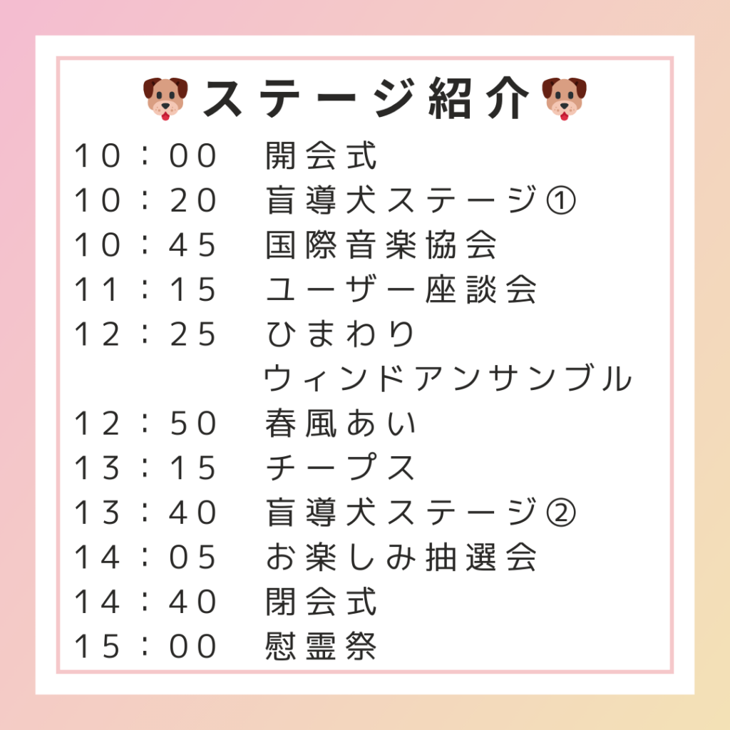 「第23回国際盲導犬デーin神戸」開催!!(4/27更新) 2025.04.10 | ニュース 国際盲導犬デーin神戸 「第23回国際盲導犬デーin神戸」は無事終了いたしました。 本当にありがとうございました🌟 2025.4.27更新 本日時点での盲導犬デー当日(4月29日)の天気予報の結果、 雨天による中止はございません。予定通り開催いたします☀️ 2025年4月29日(火・祝) 「第23回 国際盲導犬デーin神戸」の開催が決定しました!! 本年も湊川公園で開催いたしますので、ぜひお越しくださいませ✨ ※追加情報があれば本ページに掲載してまいります 🐶追加情報🐶 ステージスケジュールのお知らせです!
